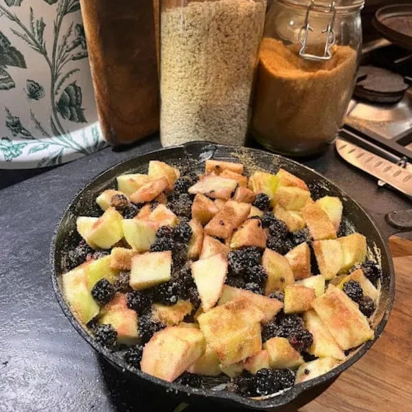 - In a cast iron pan, place the peeled and chopped bramley apples and blackberries. Sprinkle 50g of the demerara sugar over the apples and blackberries, then dust with the cinnamon.